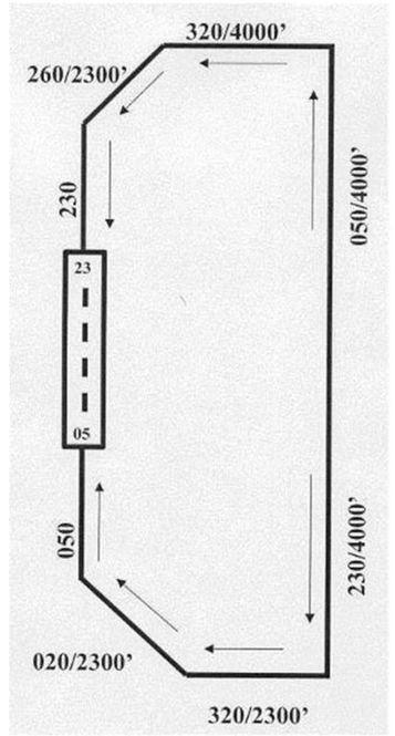 Conventional Rectangular Traffic Pattern, Non-Fighter Type Aircraft. Pattern altitude is 1,500 ft. MSL; Light Aircraft/Helicopter Pattern altitude is 1,000 ft. MSL. Pattern is to the south; left downwind Runway 23/Right downwind Runway 05.