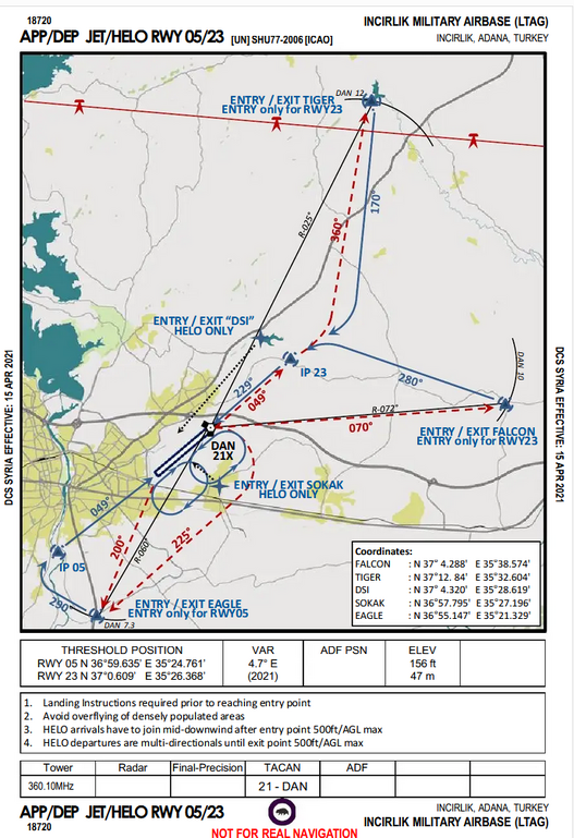 Per KSL KO210426B, US Army Task Force Blackhawks may fly training traffic patterns within Incirlik ATC Tower airspace every Monday from 1700 – 2300L. Aircraft will fly unarmed, with appropriate diplomatic transponder codes, and TurAF inspection, if necessary.